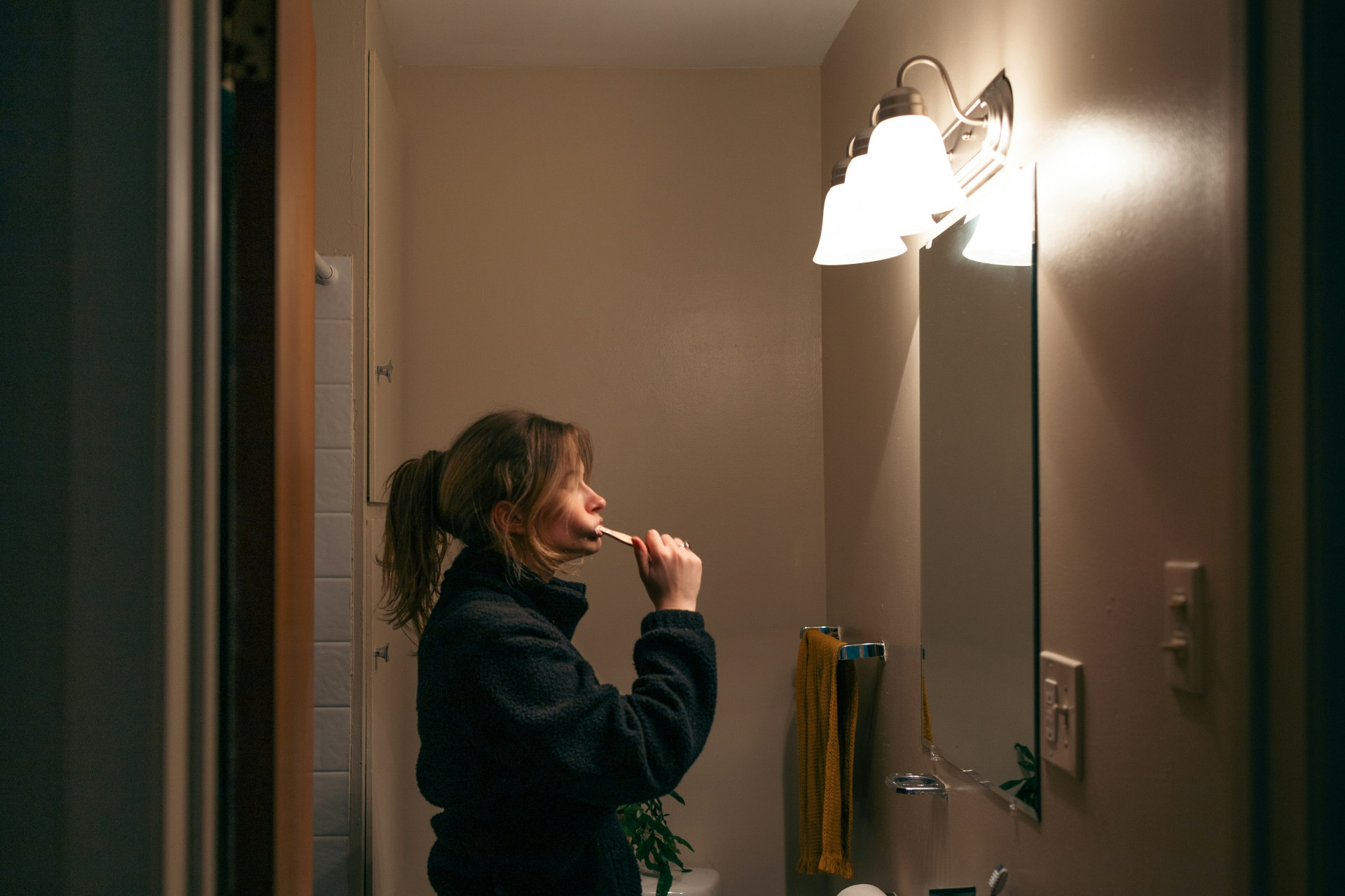 Brug dæmpbart lys eller lamper med varm farvetemperatur. Kombinér funktionelt lys med indirekte belysning, fx bag spejlet eller under skabe, for at skabe en rolig atmosfære.